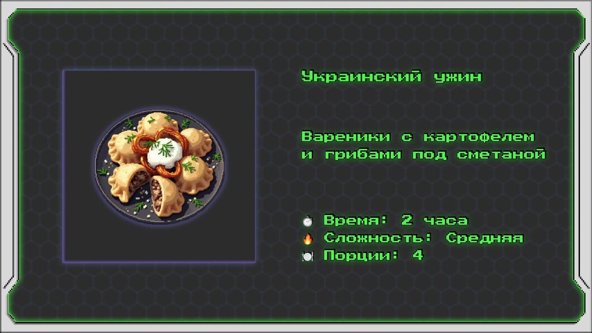 Украинский ужин Вареники с картофелем и грибами под сметаной Этот рецепт представляет собой классическое украинское блюдо — вареники с начинкой из картофеля и лесных грибов. Они готовятся на основе домашнего теста и подаются со сметаной и обжаренным луком. Это сытное и традиционное блюдо, которое идеально подходит для ужина в кругу семьи. Информация о рецепте: ⏱️ Время: 2 часа 🔥 Сложность: Средняя 🍽 Порции: 4 Ингредиенты: 🧄 Для теста: • 🥔 Мука пшеничная — 500 г • 🥚 Яйцо куриное — 1 штука • 🧴 Вода (холодная) — 250 мл • 🧂 Соль — 1 чайная ложка 🍄 Для начинки: • 🥔 Картофель (очищенный и натёртый на мелкой тёрке) — 700 г • 🍄 Сушёные лесные грибы (например, белые или подосиновики) — 30 г • 🧅 Лук репчатый (мелко нарезанный) — 1 штука • 🧄 Чеснок (измельчённый) — 2 зубчика • 🧈 Масло сливочное — 30 г • 🫒 Оливковое масло — 1 столовая ложка • 🧂 Соль — по вкусу • 🌶 Молотый чёрный перец — по вкусу 🥄 Для подачи: • 🥛 Сметана (жирностью 15–20%) — 200 г • 🧅 Лук репчатый (то