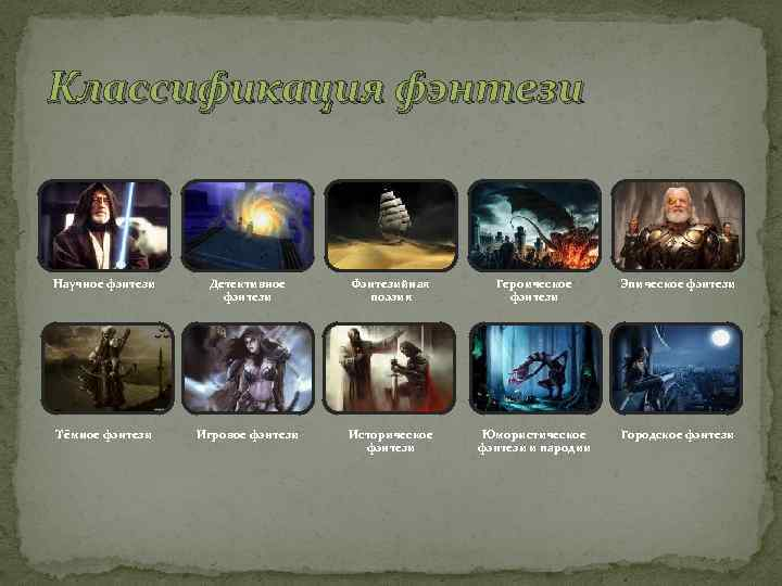 Эпическое/высокое фэнтези: мифические истории с хорошо проработанными персонажами и сюжетными линиями, для которого характерны сюжет и темы эпического масштаба (например, «Малазанская книга павших» С. Эриксона и «Властелин колец»). Героическое фэнтези посвящено героям в воображаемых землях. Часто главный герой не хочет быть героем, имеет низкое или скромное происхождение, а также королевских предков или родителей, но не знает об этом. «Меч и магия» – приключения героев, владеющих мечом, как правило, более ограничены в масштабах, чем эпическое фэнтези; сильный варвар-воин противостоит как людям, так и сверхъестественным противникам («Конан-киммериец» Роберта И. Говарда). Темное (дарк) фэнтези сочетает фэнтези с элементами ужасов. Литературная сказка – современный литературный аналог сказок. Мифическое фэнтези основано на мифах, фольклоре и сказках. А также городское, юмористическое фэнтези, фэнтези «плаща и шпаги» и т. п. Жанры (или поджанры, как говорят литературоведы США) между собой порой пересекаются.