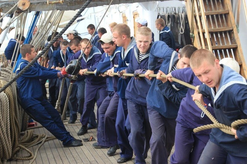 Как быстро летит время! В текущем году четырёхмачтовому барку «Седов» исполнилось 104 года (23 марта)! В жизни парусника было много интересных эпизодов. Например, в 1936 году новый владелец судна — судоходная компания «Норддойчер Ллойд» — оборудовала его кубриками на 70 кадетов для учебных целей. Переименованный в «Коммодор Йонсен», барк стал использоваться не только для коммерческих перевозок, но и для подготовки моряков. В 1991 году судно передали Мурманскому государственному техническому университету (МГТУ), и трудовая вахта «Седова» продолжается под российским флагом. Многие из тех, кто сейчас работает в море штурманами, механиками, электромеханиками и т. д., в прошлом проходили плавательную практику именно на этом судне. Уникальное фото, сделанное в 2014 году, подтверждает сказанное выше. На снимке — курсанты МГТУ, натягивающие парус. Тяжело в ученье — легко в рейсе! Фото от https://vk.me/kustya32 специально для Морфлот: