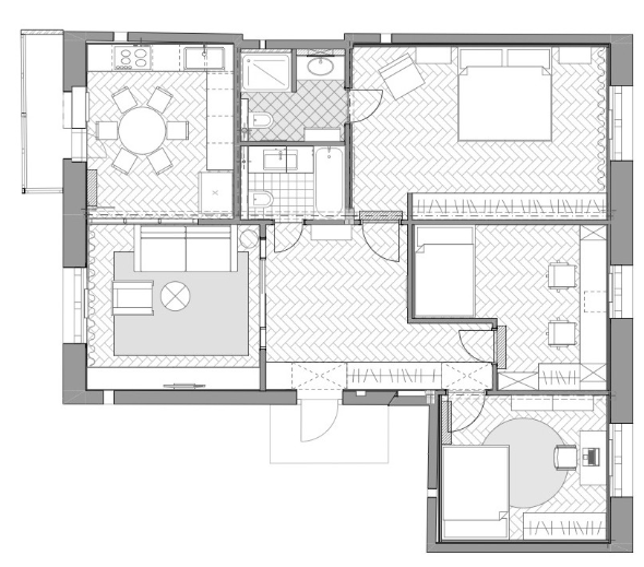 Новыми владельцами просторной квартиры в Москве стала молодая семейная пара с тремя детьми. Для того, чтобы грамотно использовать пространство и красиво оформить интерьер, сочетая признаки старого и нового — так, чтобы создавалось ощущение семейной истории, супруги обратились к дизайнеру Инне Величко. По дизайн-проекту которой позже был выполнен капитальный ремонт. В процессе перепланировки удалось организовать четыре изолированных комнаты (две детских, спальню, гостиную-кухню и два небольших санузла. Входная зона получилась довольно просторной и парадной, и задала тон всему интерьеру квартиры. Приятный оттенок серо-голубого плавно перетекает из одной комнату в другую в сочетании с синим, терракотовым, красным, серым и белым цветами. Антикварное зеркало, лепнина, раскладка инженерной доски английской ёлочкой, белые классические двери – всё это придает интерьеру истории и подчеркивает аутентичность «сталинского» здания. Владельцы любят и умеют принимать гостей, поэтому им требовался бол