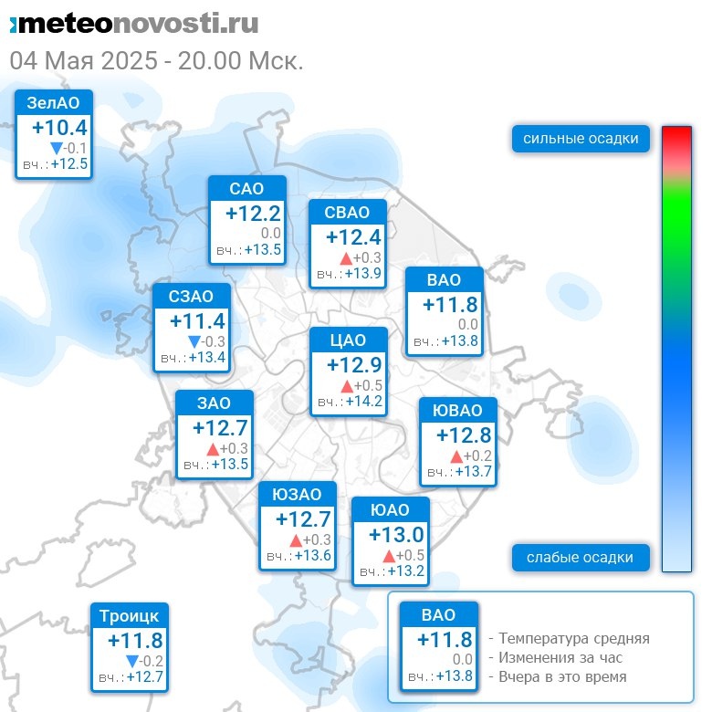В 20:00 в Москве было от +10.2°C до +13.5°C, средняя температура +12.2°C #погода #Москва #весна #температура #4мая #воскресенье