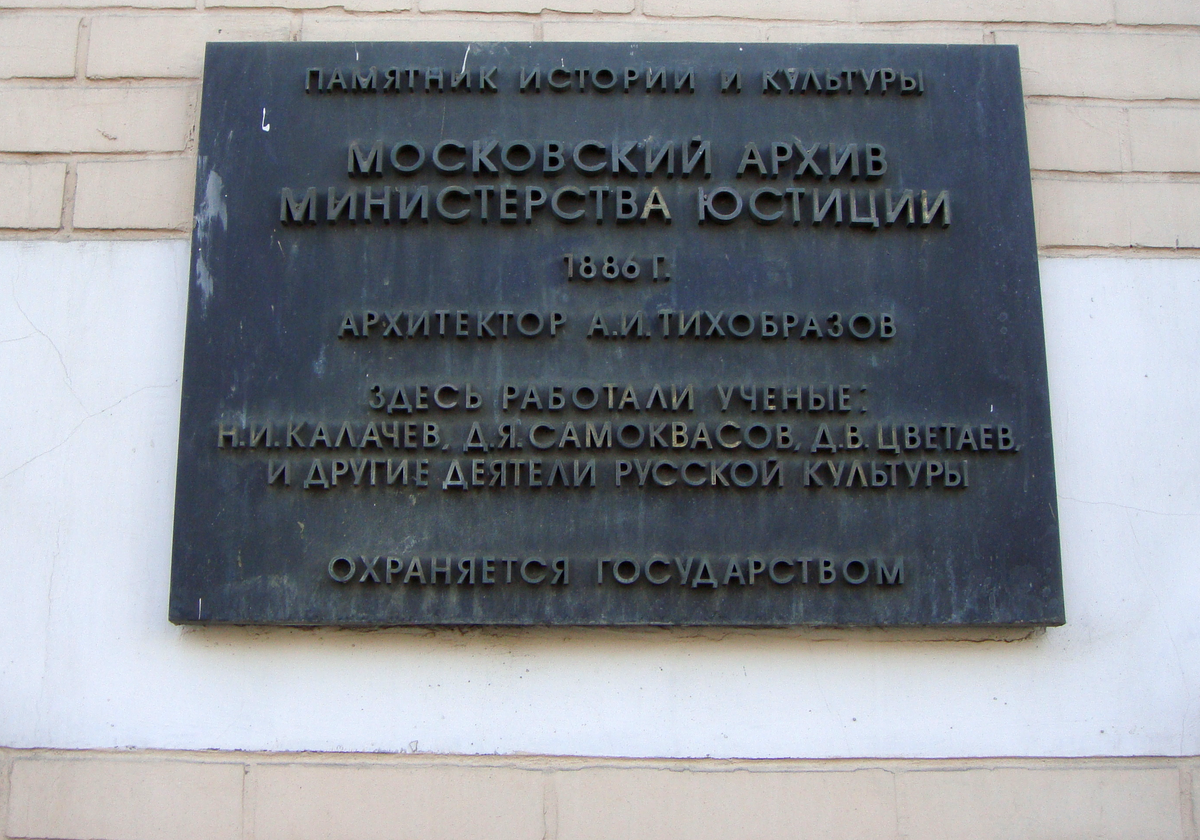 Само здание архива старинное, и, как гласит мемориальная доска, «памятник истории и культуры. Московский архив министерства юстиции. 1886 г. Архитектор А. И. Тихобразов. Здесь работали ученые Н. И. Калачёв, Д. Я. Самоквасов, Д. В. Цветаев и другие деятели русской культуры». Правда, то был, видимо, не тот Калачов Н. В., знакомый мне по «Писцовым книгам VI века» и осветивший местности Ярославской, Тверской, Витебской, Смоленской, Калужской, Орловской, Тульской губерний, но всё равно приятно. Жаль только, что ни один из деятелей русской историографии так и не издал писцовых книг интересующего меня Мценского уезда! Ну что ж, нет худа без добра, стану первопроходцем!