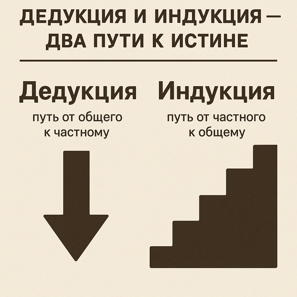 Дедукция — от общего к частному Индукция — от частного к общему ТЕОРИЯ: как работает логика мышления Дедукция — логика Шерлока Если все А — это B, и X — это A, значит, X — это B. Пример: Все философы мыслят. Сократ — философ. Вывод: Сократ мыслит. Вывод железный: если посылки верны, он 100% точен. Индукция — логика учёного Ты видишь много частных случаев и делаешь обобщение. Пример: Я видел 100 белых лебедей → значит, все лебеди белые. Вывод вероятностный — может оказаться ложным. Метафора: ПРАКТИКА: отличай и применяй Задание 1. Найди примеры в реальности Оцени: обоснован вывод или нет? Задание 2. Построй сам Почувствуй разницу: где ты уверен, а где — предполагаешь? МНЕМОТЕХНИКА: стрелка и лесенка Представляй, как ты спускаешься или поднимаешься в мыслях. ЦЕЛЬ ДНЯ: Научиться видеть и строить два базовых типа умозаключений. Без них — логика превращается в догадки. Ждёшь День 5? Подпишись и не пропусти продолжение.
