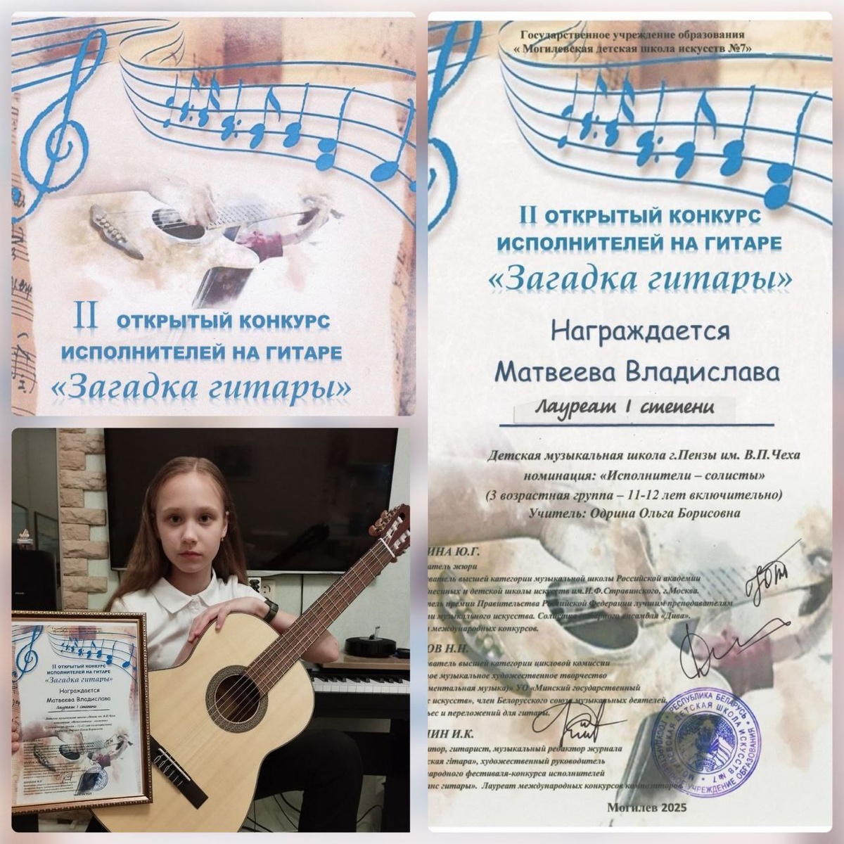 Конкурс "Загадка Гитары"проводился в г.Могилёве уже второй раз,пока это открытый конкурс, но география его очень разнообразна: Могилёв, Гомель, Витебск, Полоцк, Минск, Мачулищи, Брест, Москва, Пенза, Саратов, Калуга, Саров, Новороссийск,Вологда Калининград, Башкортостан г. Сибай, Видное, Санкт-Петербург . Учащаяся ДМШ им. В. П. Чеха Влада Матвеева (преп.Одрина О. Б.) успешно приняла участие в конкурсе с высоким результатом Лауреата I степени Поздравляем Владу с победой!Желаем новых успехов ,ярких идей, уверенных шагов навстречу к своим мечтам! #культура58 #penza_kult. #ДМШимВПЧеха