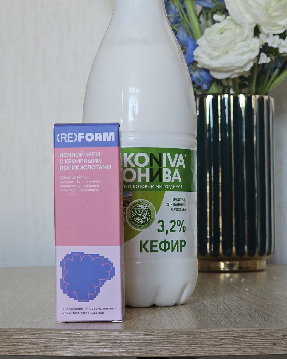 Не успела вчера, исправляюсь сегодня: делюсь ночным уходом Пока вы, может, заливаете кефирчик в себя, я заливаю его и в себя и на лицо. Ну почти. Взяла ночной крем от (Re)foam с кефирными PHA-кислотами 7%, и это лучший вечерний апгрейд за последнее время Крем мягко отшелушивает и увлажняет кожу (работает даже с чувствительной кожей), не сушит и не щиплет. С утра гладкое, спокойное лицо, как будто и не было усталости Без парабенов, силиконов, сульфатов: всё по уму. И да, фишка бренда — рефилы. Больше никаких одноразовых банок: купили кейс один раз и просто обновляете содержимое. Красиво и экологично