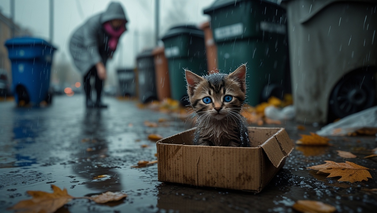 В коробке сидел котёнок. Маленький. Такой худющий, что ребра сквозь мокрую шерсть. Весь дрожал. Глаза — синие, как у младенца, смотрели прямо в душу. И пискнул опять. Совсем жалобно.