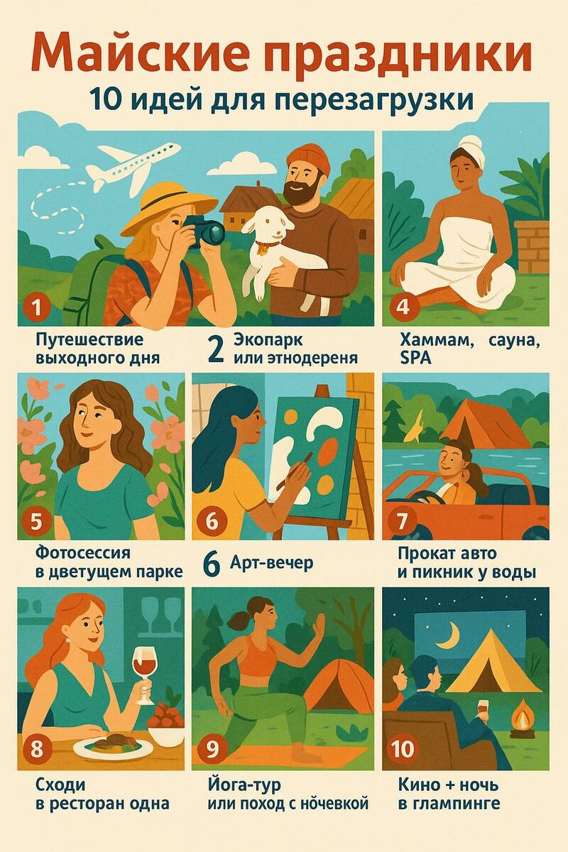 🔥Майские — перезагрузись по-взрослому: 1️⃣🔥 идей отдыха, которые стоят того (и не требуют кредита) Ты правда собираешься снова «проваляться все праздники» между холодильником и сериалом «для фона»? А ведь можно подарить себе не просто отдых, а новую энергию. Без люксовых отелей, но и не в обнимку с гречкой. Вот 1️⃣🔥 способов сделать майские праздники насыщенными, яркими и терапевтичными — на адекватный бюджет: 1️⃣Путешествие выходного дня. Садись в поезд до ближайшего красивого города. Плёс, Коломна, Суздаль, Казань, Калининград, Петербург. Отели за 2–3 тысячи, воспоминания — бесценны. 2️⃣ Экопарк или этно деревня. Купи билет, забудь про телефон и погрузись в атмосферу уюта, козлят и печёного хлеба. 3️⃣ Тренинг или ретрит. Один день тишины с психологом или дыхательные практики на природе — и ты будто месяц отдыхала. 4️⃣ Хаммам, сауна, SPA. 2–3 тысячи — и ты снова чувствуешь тело, а не только усталость. 5️⃣ Фотосессия в цветущем парке. Красота вокруг + новый образ = заряд уверенно