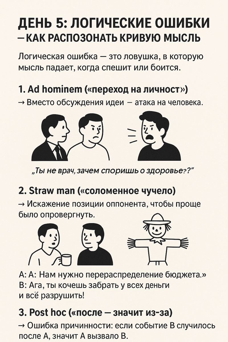 Сегодня — топ-3 самых распространённых ошибок Логическая ошибка — это баг в мышлении. Программа работает, но результат фальшивый. ТЕОРИЯ: что такое логическая ошибка Логическая ошибка — это ловушка, в которую мысль падает, когда спешит, боится или упрощает. Даже если звучит умно — может быть нелогично. Ошибки бывают: Сегодня — топ-3 самых распространённых ошибок: 1. Ad hominem — «переход на личность» Что это? Вместо идеи атакуют человека. Пример: «Ты не врач, зачем споришь о здоровье?» 2. Straw man — «соломенное чучело» Что это? Искажают позицию оппонента, чтобы проще её опровергнуть. Пример: A: «Нужно пересмотреть бюджет.» B: «Ты хочешь разрушить страну и всё забрать!» 3. Post hoc — «после значит из-за» Что это? Путают последовательность с причинностью. Пример: Я съел бургер и получил пятёрку. → Значит, бургер помогает учиться. МЕТАФОРА: баги в коде Ошибки логики — это как сбои в алгоритме мышления. Всё вроде запускается… но даёт ложный результат. ПРАКТИКА: охотимся н