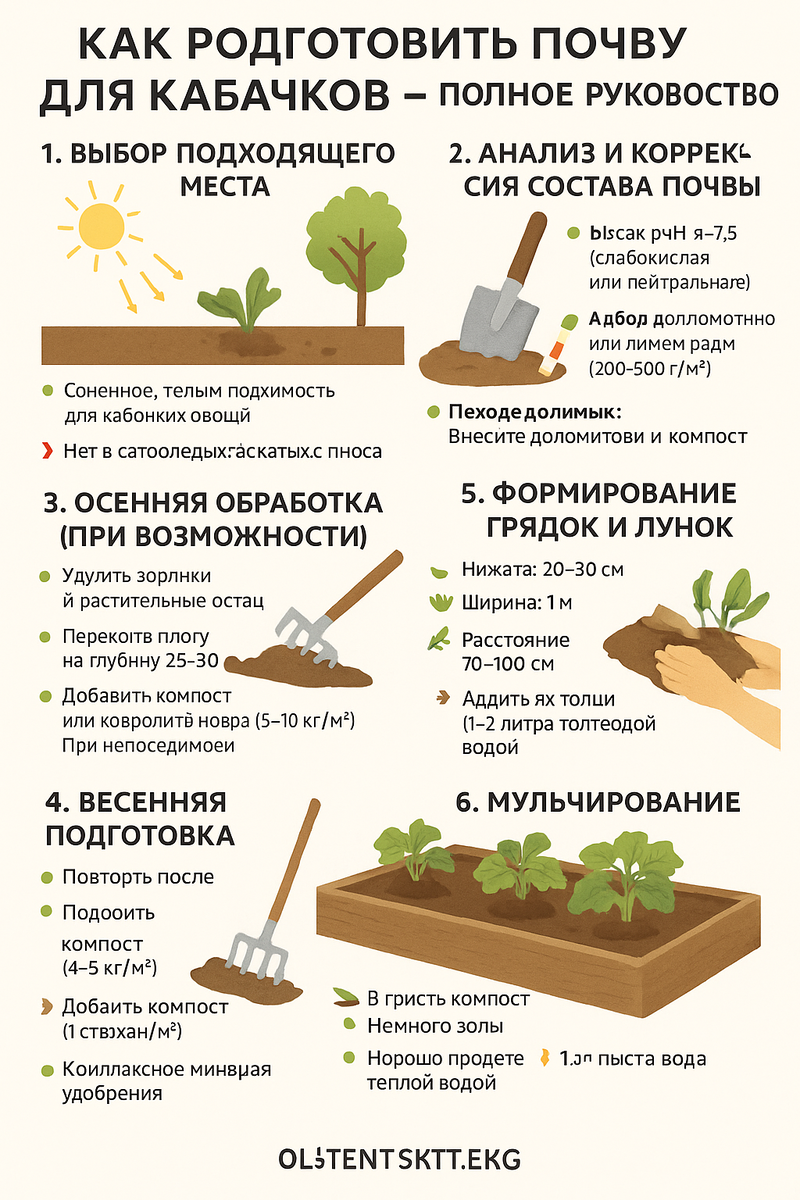 Кабачки — один из самых неприхотливых и благодарных овощей на грядке. Они быстро растут, дают обильный урожай и не требуют сложного ухода. Но всё начинается с правильной подготовки почвы. Именно от неё зависит здоровье растений, их устойчивость к болезням и количество плодов. 1. Выбор подходящего места Для кабачков подбирают: Не рекомендуется сажать кабачки: 2. Анализ и коррекция состава почвы Кабачки лучше всего растут на: Что делать, если: 3. Осенняя обработка (при возможности) Осенью можно заложить основу плодородия: 4. Весенняя подготовка Весной, за 1–2 недели до посадки: Разровняйте граблями, чтобы грядка стала ровной и рыхлой. 5. Формирование грядок и лунок Грядки: Лунки: Совет: кабачки отлично растут на тёплых грядках, где под верхним слоем земли заложена органика (трава, навоз, листья). 6. Мульчирование После посадки мульчируйте почву: 7. Можно ли вносить навоз? Да, но только перепревший! Заключение Правильная подго