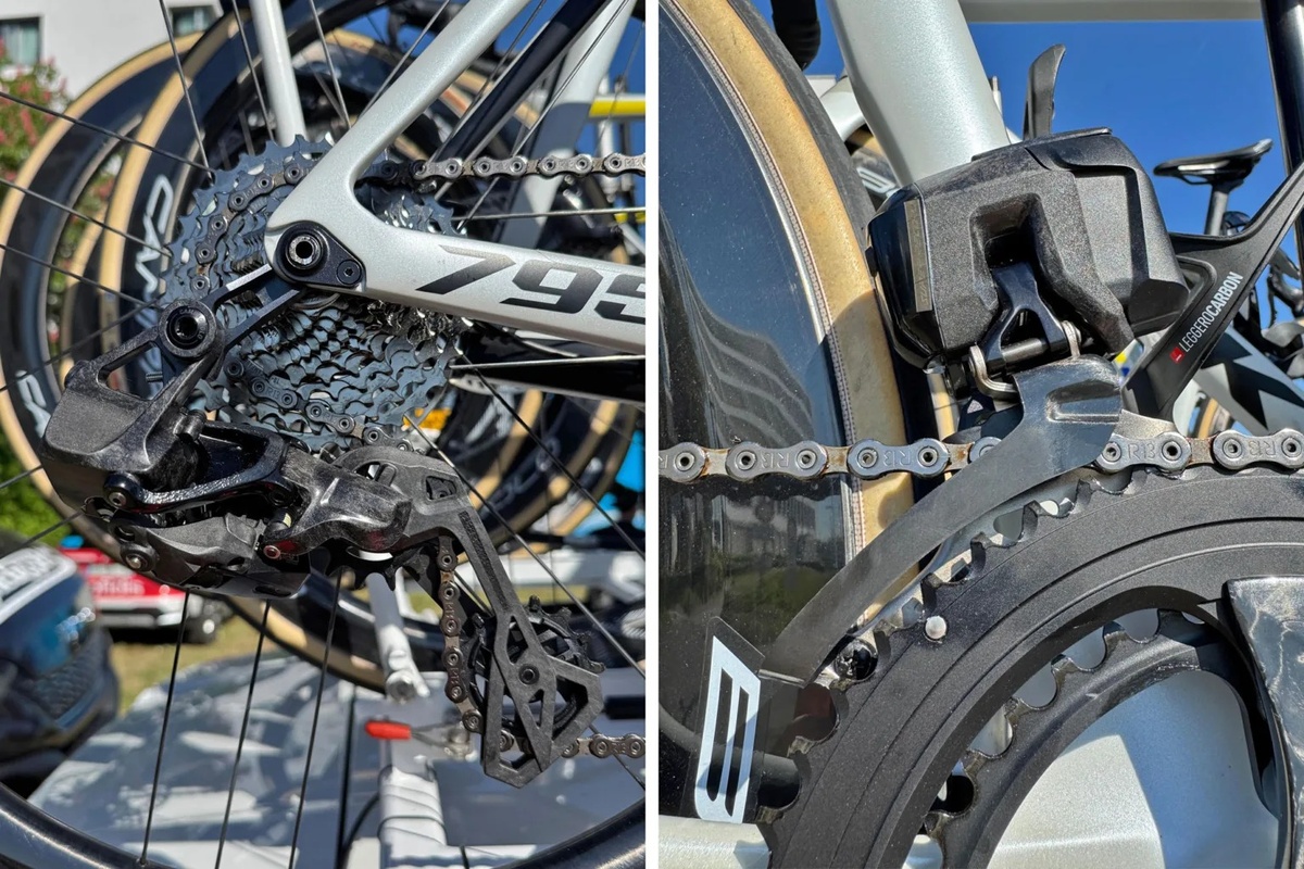 На старт гонки Ворлд Тура Эшборн — Франкфурт гонщики Team Cofidis вышли на велосипедах с прототипами новой группы. Это, конечно, не официальный релиз, но "шпион" настолько качественно всё сфотографировал, что можно с интересом поспекулировать, чего стоит ожидать от новой топовой группы 2х13 легендарного итальянского производителя. Уже скоро пять лет, как Campagnolo представили 13-скоростную гравийную группу Ekar и с тех пор все справедливо ожидали появление 13-й звёздочки и на шоссейных байках, но когда пару лет назад Campa выкатили беспроводную Super Record WRL, она была всё ещё на 12-скоростной кассете. Только сейчас итальянцы решили объединить беспроводное переключение с 13ю скоростями, как раз под своё возвращение в гонки Ворлд Тура. Задний переключатель лишён каких-либо надписей, но формы карбоновых деталек выглядят довольно аккуратно, чтобы предположить, что этот прототип близок к конечному продукту. На роликах впервые появились нарроу-вайд переменные зубья, чего у Campa не было