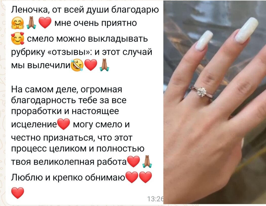 Доведу вас до счастливых отношений😏 Ещё одна моя клиентка выходит замуж — и вот это колечко с бриллиантом ей подарил её жених: Не могу не поделиться этой вдохновляющей историей и тёплым отзывом. Когда-то она пришла ко мне с тяжёлым сердцем и множеством внутренних сомнений. Её история — как живой пример того, как внутренние трансформации меняют не только ощущения, но и реальность вокруг. Всё начиналось с болезненного расставания и непростого периода: отношения не складывались, на работе было тяжело, с начальницей — конфликты, с подругами — недопонимание… В каждой сфере жизни были вопросы: ❓«Почему всё идёт не так, как я хочу?» ❓«Что со мной не так?» ❓«Почему я снова и снова оказываюсь в похожих ситуациях?» Мы работали вместе каждую неделю. Не всегда было просто: порой приходилось встречаться с сильными эмоциями, старыми обидами и непрожитыми чувствами. Но именно в таких моментах и происходил рост. Шаг за шагом она открывала для себя важные осознания, училась слышать себя, чувствовать с