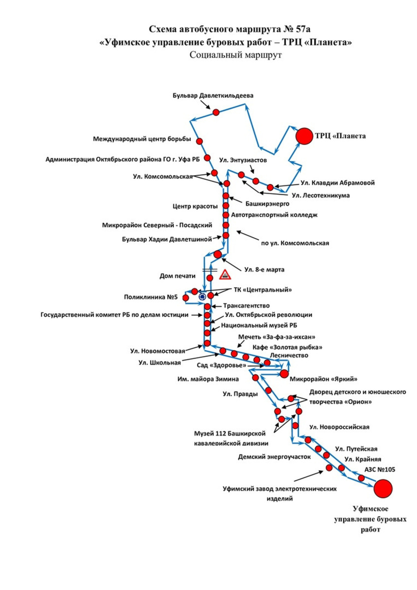 С 5 мая маршрут № 57А «Уфимское управление буровых работ — ТРЦ «Планета» изменит схему движения, сообщает «Башавтотранс». После Центрального рынка автобус будет следовать по ул. 8 Марта, ул. Комсомольской, ул. Российской, Лесотехникума, Менделеева, ТРЦ «Планета» и через Дворец борьбы выезжать на ул. Российскую, ул. Комсомольскую, ул. 8 Марта и далее по существующему маршруту. Уфимцев и гостей города просят учитывать изменения при планировании поездок. Фото предоставлено «Башавтотрансом».