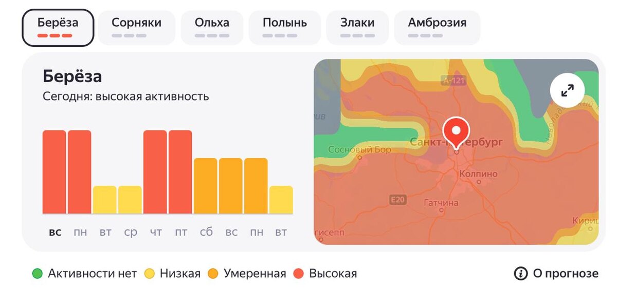 🌬️ Чихаем хором: береза шлет «привет» аллергикам Скоро в Москве и Петербурге пыльца березы устроит настоящий переполох. Чтобы не чихать на каждом шагу, чаще делайте влажную уборку, обзаведитесь очистителем воздуха и не забывайте про увлажнитель — они спасут ваши носы! Мечтаете о передышке? Пакуйте чемоданы и отправляйтесь в Карелию, Калининград, Крым или на Кубань — там пыльца вас не достанет! 🏖️ Фото: скриншот Яндекс. Погода Петербургский дневник