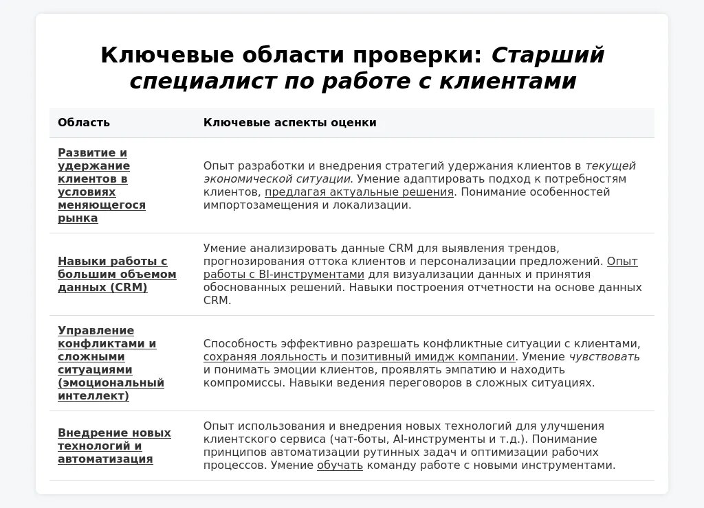 Чтобы повысить шансы на успех, необходимо тщательно подготовиться к собеседованию, продемонстрировать свои коммуникативные навыки и умение решать проблемы. Актуальные требования рынка в 2025 году включают знание современных технологий, опыт работы с CRM-системами и умение анализировать данные для улучшения качества обслуживания клиентов. Средняя заработная плата старшего специалиста по работе с клиентами в Москве составляет 120 000 - 180 000 рублей в месяц, в зависимости от опыта и квалификации.