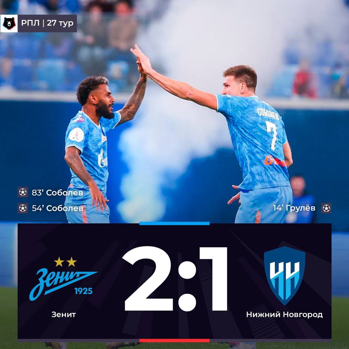 "Зенит" одерживает волевую победу в домашнем матче с "Пари НН"! Соболев разошелся не на шутку: оформил дубль во втором тайме и принес питерцам полноценные три очка голом на 83-ей минуте! ⚽️🎆 Чемпионская гонка в РПЛ жива! У "Краснодара" запас прочности 4 балла за три тура до конца🤔