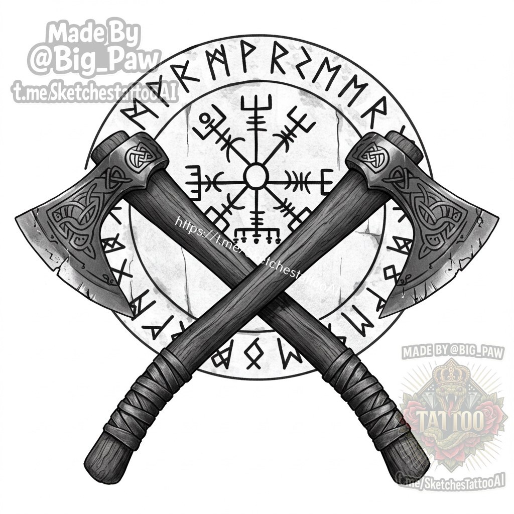 #2359 Подборка по запросу подписчика - Здравствуйте, можно пожалуйста сгенерировать, два скрещенных топора в скандинавском, возможен как нибудь фон) 🧠 SYNTX 💳 Донат 😎 НейроБро 😎 Эскизы без вотера 💀 Эскизы от нейросети #топор #скандинавская #оружие #эскизы #тату #татуировки
