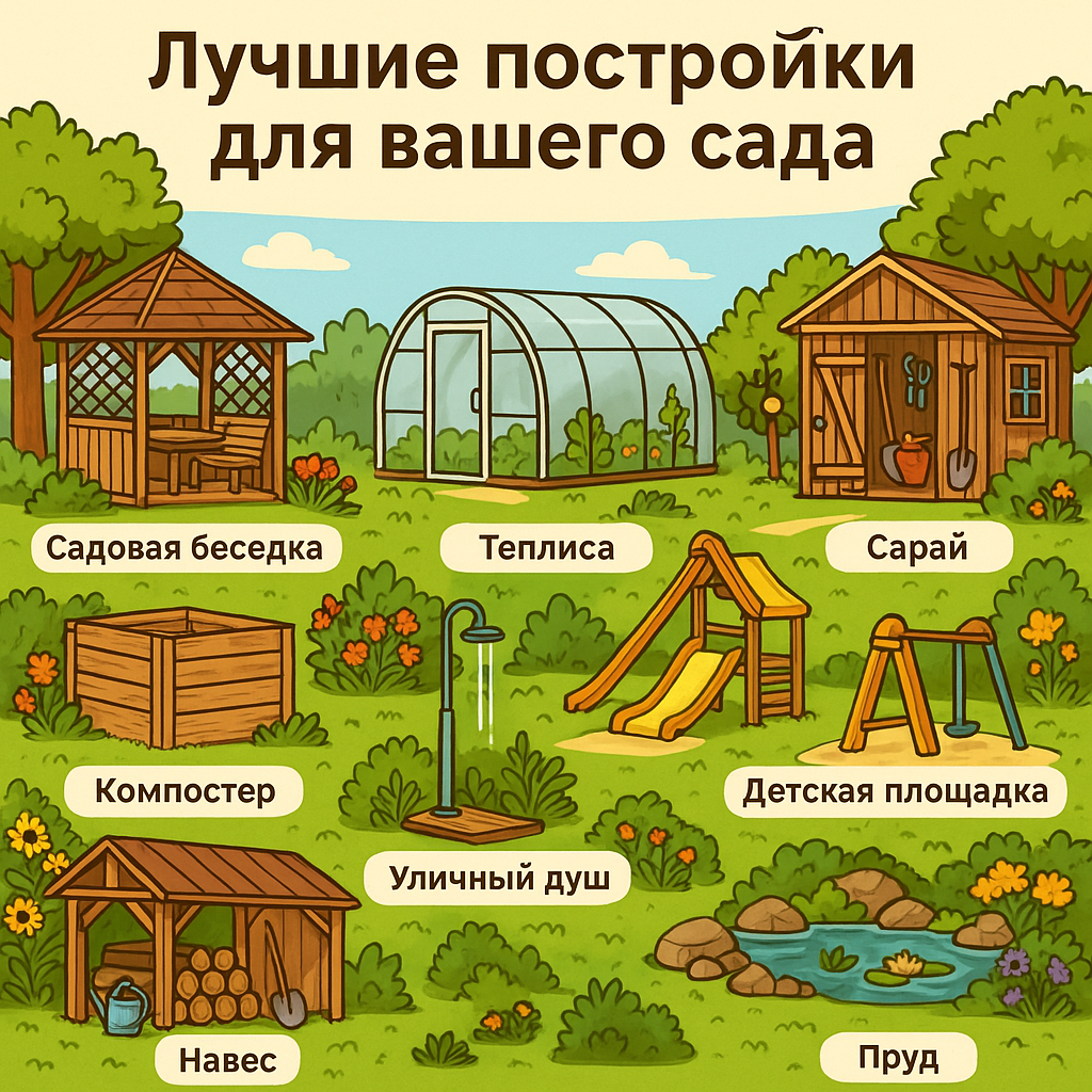 Сад — это не только растения, но и пространство, в котором удобно отдыхать, хранить инструменты и наслаждаться природой. Правильно подобранные постройки делают участок аккуратным и комфортным. Вот список самых полезных и красивых построек для вашего сада. 1. Садовая беседка — уголок отдыха Назначение: отдых в тени, чаепитие, встречи с друзьями. Преимущества: Совет: выбирайте место с хорошим видом — у клумбы, водоёма или в центре сада. 2. Теплица — свежие овощи круглый сезон Назначение: выращивание рассады, ранних овощей, зелени. Преимущества: Варианты: поликарбонат, стекло, плёнка. 3. Сарай или хозяйственный блок Назначение: хранение инвентаря, удобрений, техники. Что важно: 4. Компостер — золото для почвы Назначение: переработка органических отходов в удобрение. Плюсы: 5. Навес или дровник Назначение: хранение дров, инструмента, велосипедов. Идеи: 6. Уличный душ или мойка Назначение: освежиться в жаркий день, помыть руки или овощи с гряд