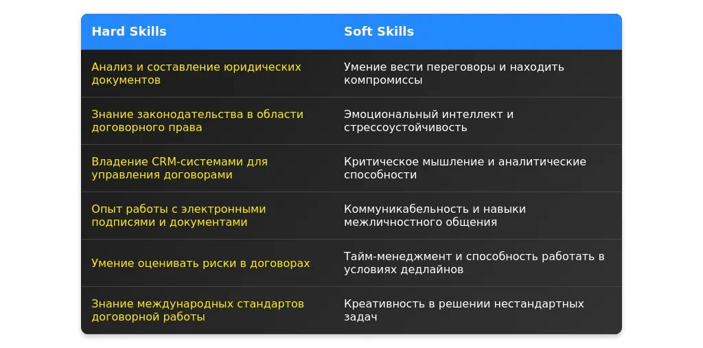 Навыки необходимо перегруппировать, чтобы в начале списка были указаны наиболее релевантные для вакансии. Например, если вакансия требует знание CRM-систем, поставьте этот навык на первое место. Используйте ключевые слова из описания вакансии, такие как "ведение переговоров", "анализ контрактов", "работа с юридической документацией".