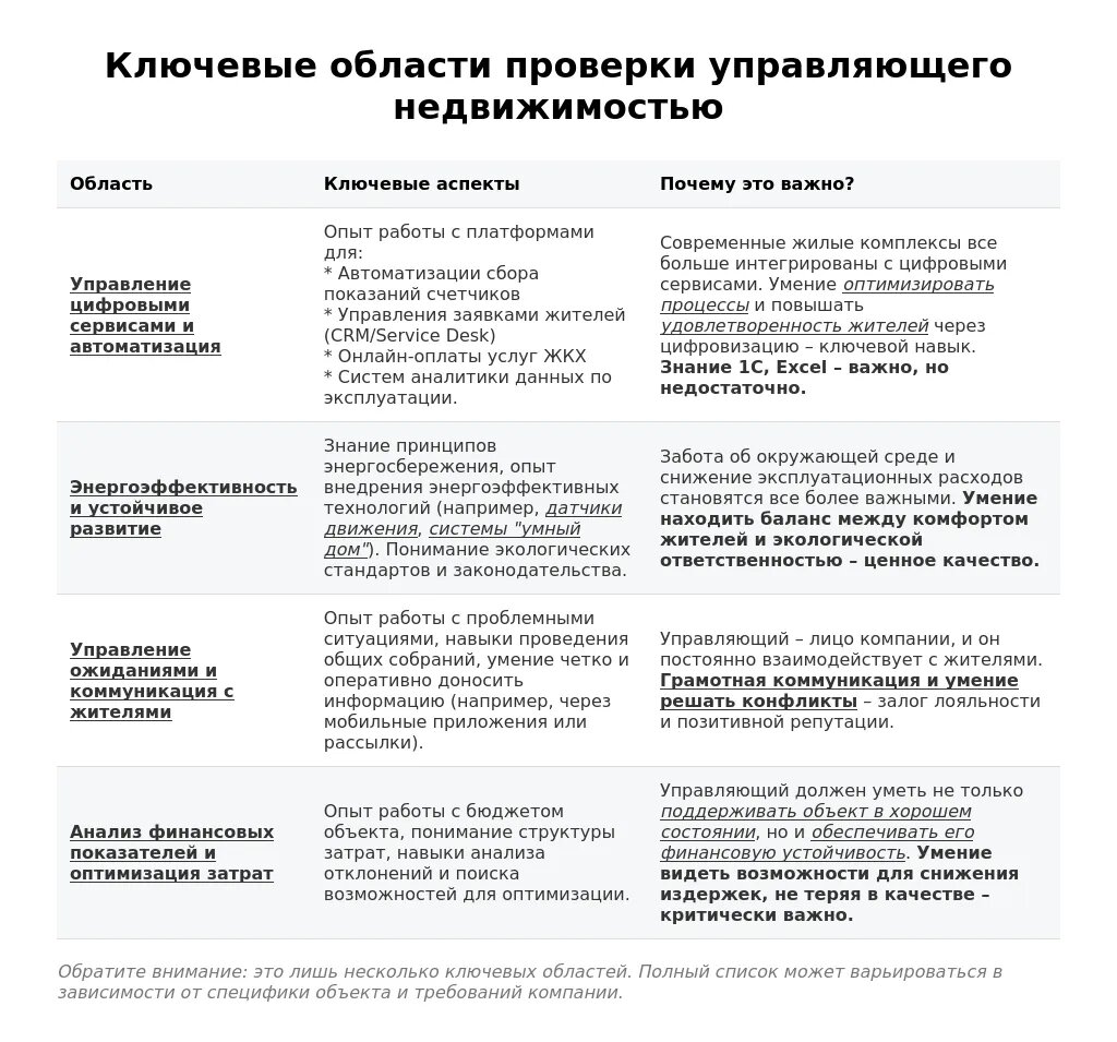 В 2025 году особое внимание уделяется знаниям в области энергоэффективности, цифровизации управления (например, системы "умный дом") и ESG-принципам (экологическая, социальная и управленческая ответственность).