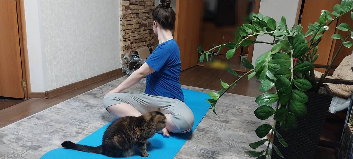 Вечером Наташа занималась йогой. Захар был рядом. Он всегда рядом, когда его подруженька чем-нибудь занята: пол моет или играет на гитаре. Вот и теперь он сидит на коврике, поддерживает. Сейчас, например, он обошёл и лёг позади Наташи. Тренирует, следит за техникой упражнений: - Дыхание держи, вот так, а теперь повтори с другой стороны, - командует Захар. - А ты чего тут делаешь, снимаешь? - Захар заметил меня с камерой, - бери коврик и тоже занимайся! В здоровом теле — здоровый дух. И на диету тебе пора. Мы вот с Наташей на диете, м-да, колбасу не едим, например. Знаешь, они какие полезные, эти самые диеты, м-м-м, пальчики оближешь. Это что у тебя там, вкусняшки? Без меня не ешь!