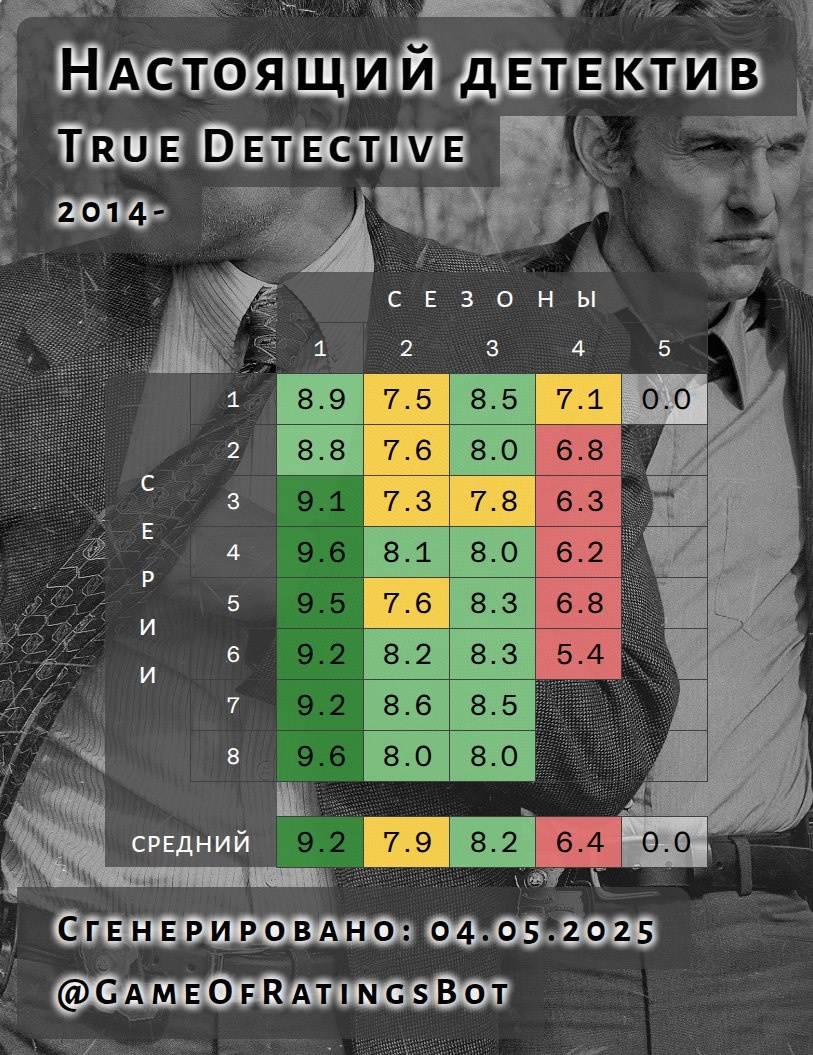 «Настоящий детектив» (ориг. True Detective) — это американский криминальный телесериал-антология, созданный Ником Пиццолатто. Каждый сезон рассказывает самостоятельную историю с новыми персонажами, сюжетами и стилем, но объединены они мрачной атмосферой, философскими размышлениями и сложными детективными расследованиями. Первый сезон, вышедший в 2014 году, стал настоящим культурным событием благодаря мощной актёрской игре Мэттью МакКонахи и Вуди Харрельсона, мрачному визуальному стилю и глубоким темам, касающимся зла, морали и человеческой природы. @GameOfRatingsBot Особенно выделяется четвёртый эпизод первого сезона — «Кто там?» (Who Goes There). Этот эпизод вошёл в историю телевидения благодаря потрясающей шестиминутной сцене, снятой одним непрерывным дублем без склеек. В этой сцене герой МакКонахи, Раст Коул, участвует в напряжённой операции под прикрытием, которая стремительно выходит из-под контроля. Камера следует за ним сквозь хаос, переулки, дома и перестрелки, создавая ощущени