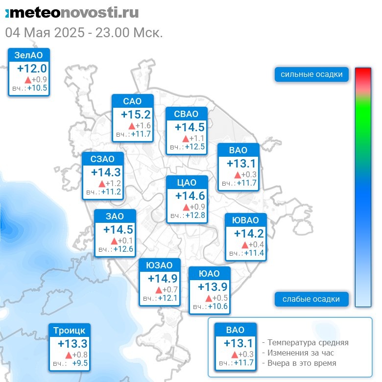 В 23:00 в Москве было от +11.8°C до +15.8°C, средняя температура +14.1°C #погода #Москва #весна #температура #4мая #воскресенье