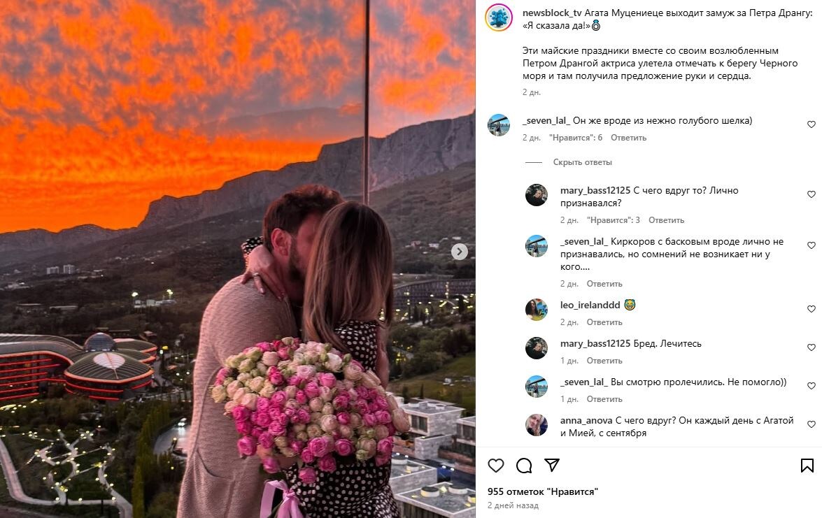 "Подписчики поздравляют пару, но обращают внимание на одну важную деталь: Агата получила предложение руки и сердца, но не получила кольцо?" – началось брожение в сети. Целое расследование! А может, она носит его на левой руке, как на Западе? Но в кадре видна ПРАВАЯ рука Агаты, и там его нет! "А может Агата на пассажирском месте. Снимает правой рукой. На фронтальную камеру. Поэтому изображение отзеркалено, в кадре левая рука?" – выдвигают версии интернет-детективы, пытаясь объяснить отсутствие главной улики. Это уже высший пилотаж анализа контента!