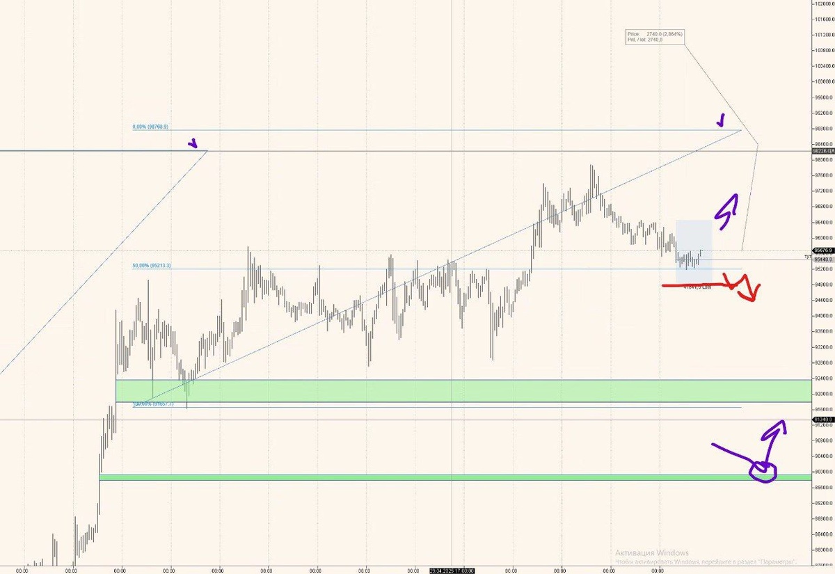 График Биткойна. Цена недоработала модель, о которой я писал выше, и вместо этого сформировала более локальную — с целью, близкой к предыдущей. Сейчас мы находимся на тесте точки вращения — и это хорошее место для лонга. Стоп можно разместить за уровнем отмены точки, но учтите: биткойн любит глубокие манипуляции — то, что на других активах ломает модель, ему вообще не мешает. Ниже есть покупатель, его тест тоже буду использовать для входа в лонг. Ну и эффект понедельника: очень часто именно в ночь на понедельник (у нас — ночь) крипта показывает «где раки зимуют» всем инфлюенсерам😀. Не ИИР