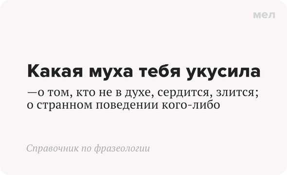 Что произошло с человеком? Почему он ведет себя агрессивно и странно? Какая муха его укусила? Эта фраза — синоним вопросов «Что с тобой случилось?» или «Что не так?» — имеет французское происхождение. Рассказываем. Это прямое заимствование из французского — «Quelle mouche vous pique?». Выражение восходит к древним суевериям (распространенным и у славян), согласно которым в мух мог превращаться дьявол — а потом через нос, рот или уши проникал в человека и менял его поведение. «Укушенные» такими «дьявольскими» мухами люди были злыми, нервными и несговорчивыми. Больше полезных карточек о русском языке — в «Грамотности» на «Меле» в Telegram. Подписывайтесь, чтобы говорить и писать правильно. Иллюстрация: Alphavector / Shutterstock / Fotodom