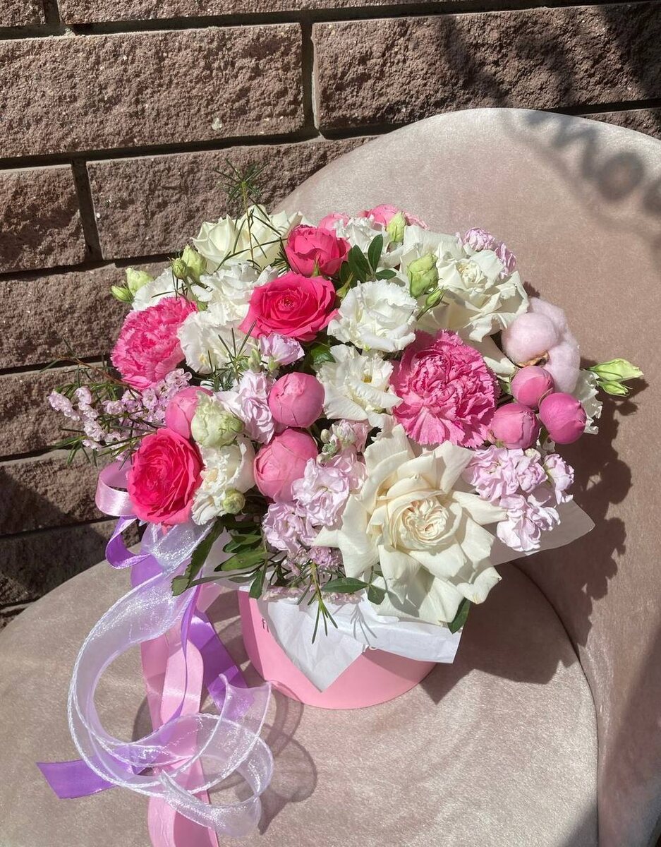 Цветочная коробочка в розово-белой гамме с пионовидными розами и кружевной эустомой💕