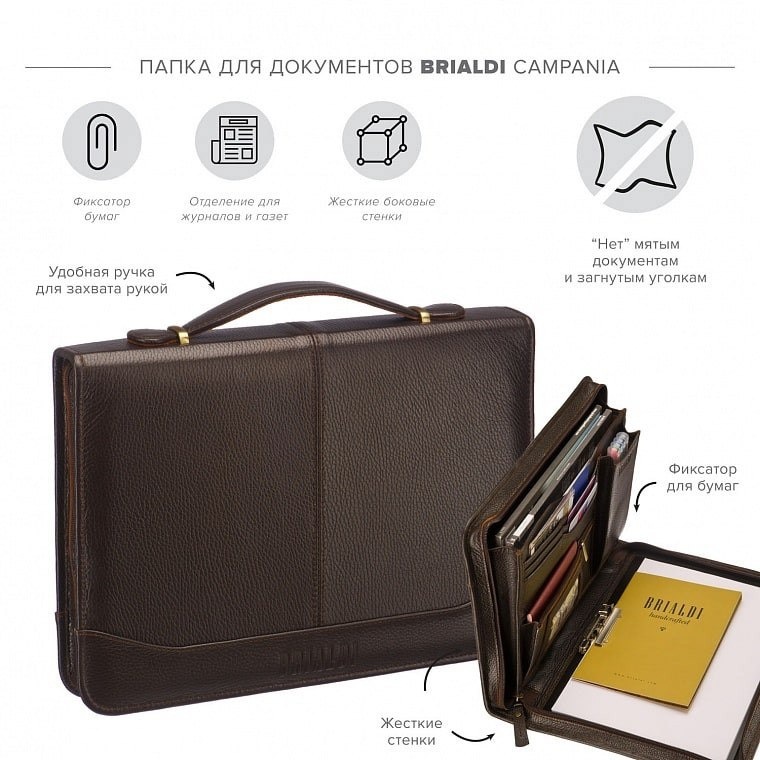 Мужская кожаная папка для документов BRIALDI Campania BR26709MR relief brown, 13950 руб. Посмотреть: http://2chemodana.ru/muzhskaya-kollektsiya/sumki/papki/muzhskaya-kozhanaya-papka-dlya-dokumentov-brialdi-campania-br26709mr-relief-brown/, Описание: Папка для документов BRIALDI Campania BR26709MR relief brown Элегантная функциональная мужская папка. Внутрь помещается мобильное устройство с диагональю до 13 дюймов/iPad, бумаги формата А4. Выполнена из высококачественной натуральной кожи Canyon. Универсальная модель как для мужчин, так и для женщин. Замок на молнии. 1 основное внутреннее отделение. Внутри: карман для мобильного устройства на молнии, кармашки для ручек, множество отсеков для пластиковых карт/визиток, отсек на молнии с прозрачным окошком, дополнительные держатели для ручек, держатель-зажим для бумаг формата А4, карман формата А4. Удобная ручка. Надежная и качественная фурнитура. Материал: натуральная кожа. Размер, см.: 36*26,5*5. Производство: Россия.