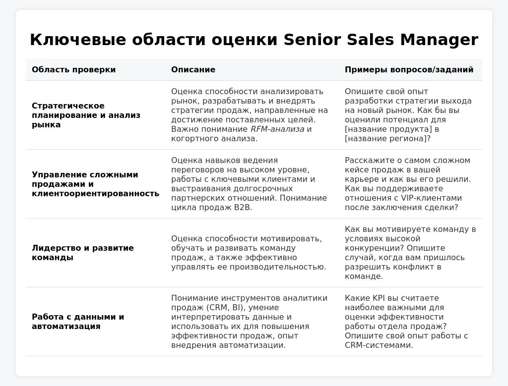 Успех на собеседовании на позицию Senior Sales Manager во многом зависит от тщательной подготовки. Начните с детального анализа вакансии. Выявите ключевые soft skills, которые требуются работодателю. Обратите внимание на такие слова, как "лидерство", "коммуникабельность", "умение вести переговоры", "ориентация на результат", "клиентоориентированность" и "стратегическое мышление".