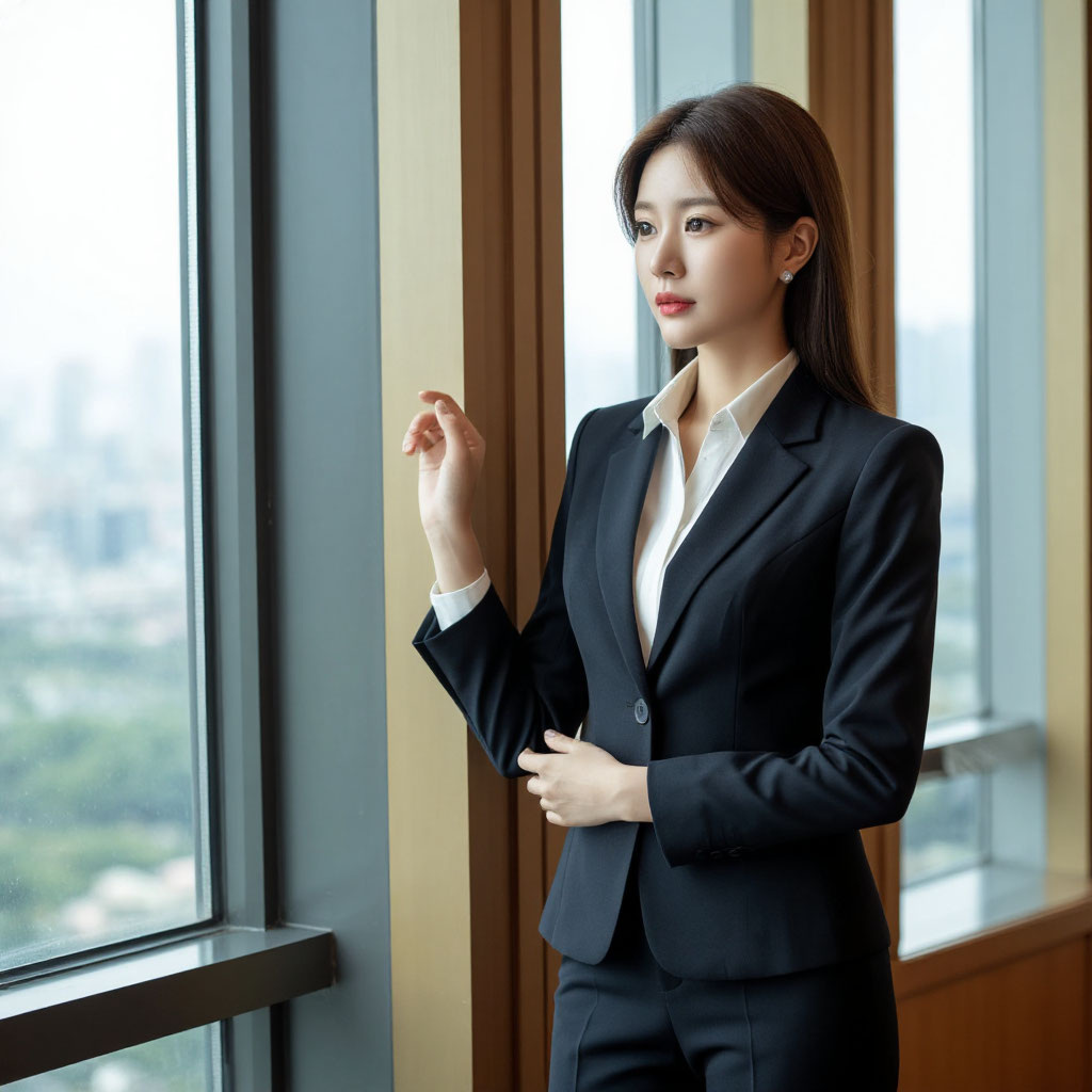 У окна стоит женщина в строгом брючном костюме.