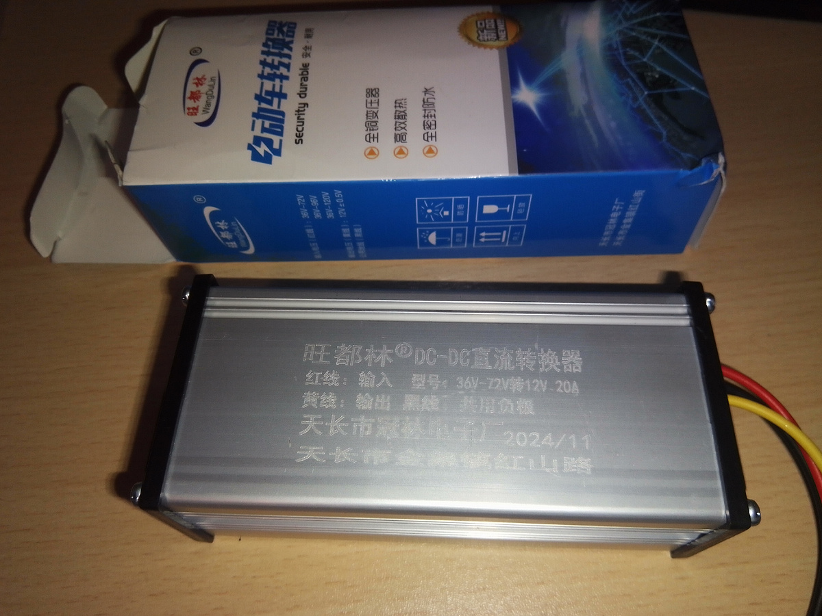 Понижающий DC-DC 36-60V ->12V 20A (10А). Куплен на озоне. Красный провод - входное напряжение (+ 36В...60В) черный - общий для входного и выходного напряжения, жёлтый - выходное напряжение (+12В). Исполнение не герметичное. Замена проводов и установка разъемов + картон под плату (изоляция), подключен АКБ на 36В на выходе стабильное 12В для авто холодильника через гнездо прикуривателя. Длительный ток 10А , пиковый 20А