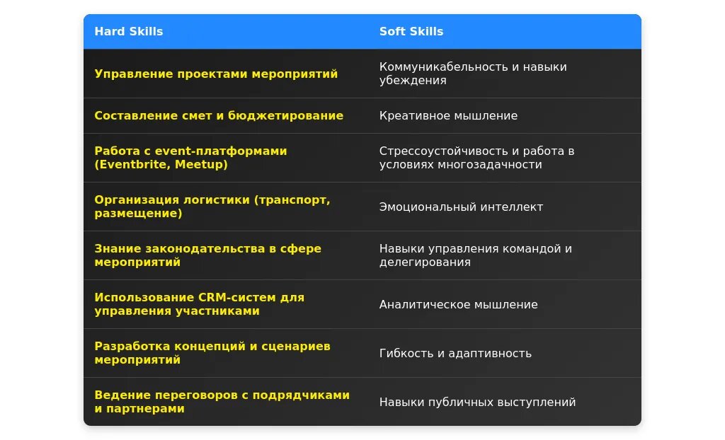 После адаптации: "Опыт работы с CRM-системами и Event Management, знание английского языка на уровне Advanced, управление бюджетами мероприятий."