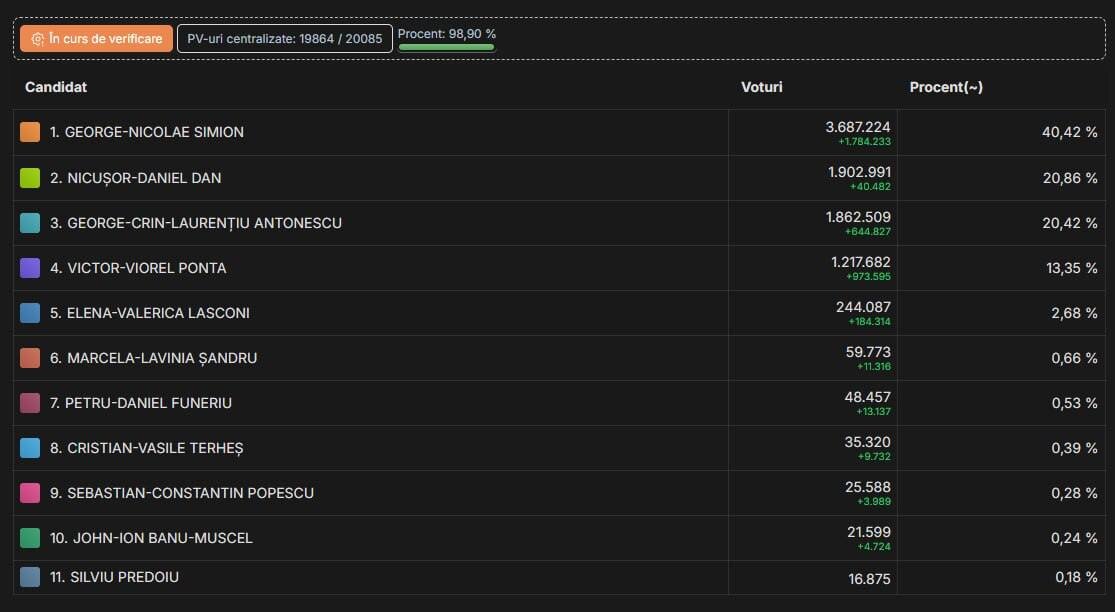 Romanian election: Bucharest Mayor Nicusor Dan surges past Crin Antonescu, now in second place with 98.90% of votes counted Nationalist George-Nicolae Simion is a clear winner in the first-round presidential vote. #Romania