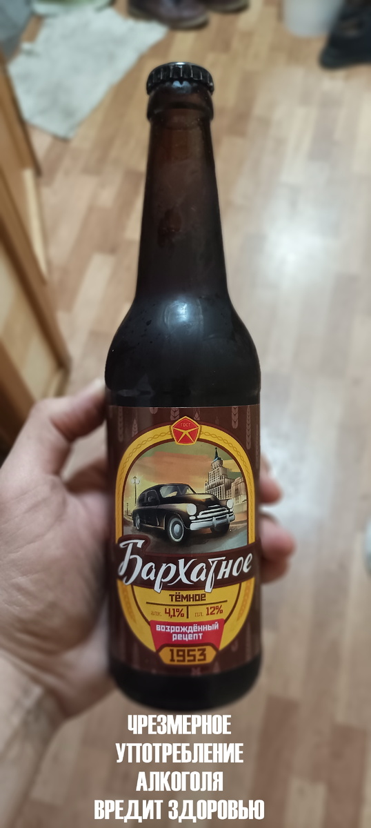 Тут в створке холодильника обнаружил ещё одну «обзорную» единицу напитка: тёмное фильтрованное непастеризованное пиво «Бархатное», «Возрождённый рецепт 1953». Этот напиток родом из Воронежа.