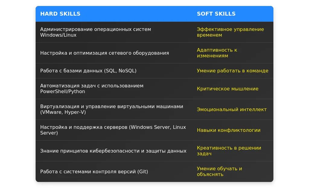- Профессиональную специализацию (сети, базы данных, ПО).