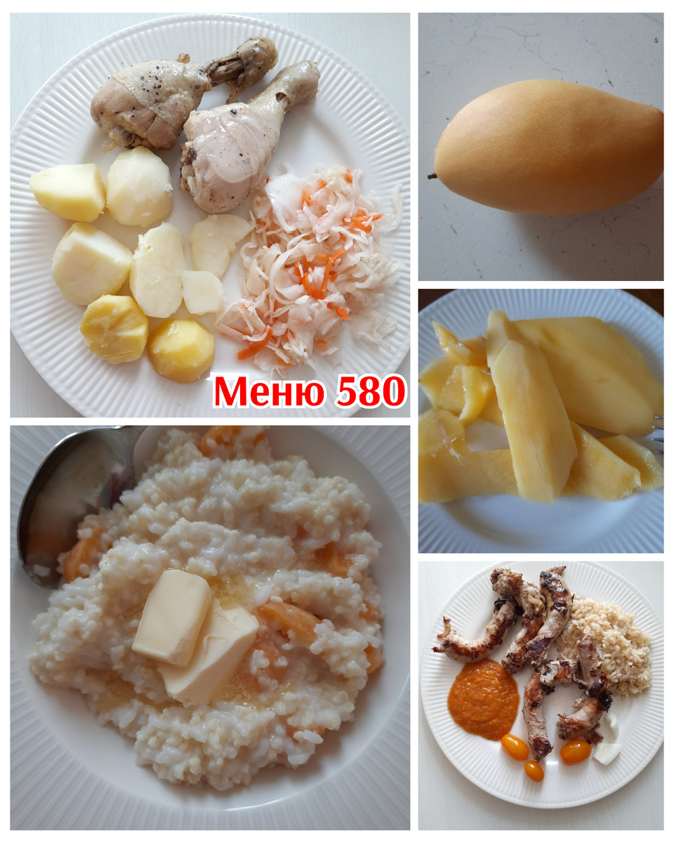 #Завтрак – каша Дружба (круглозерный рис и пшено), на молоко-воде с курагой. Сначала варю на воде до готовности крупы. В конце добавляю молоко и все прогреваю. Порционно сливочное масло. Но с каш на завтрак, я не наедаюсь. Ну что тут? Просто углеводы из крупы. Для разнообразия готовлю, но это мой не особо любимый завтрак. #Обед – отварной картофель. Куриные голени, тушеные с солью и перцем на воде. Квашеная капуста готовая, по типу вот такой: #Десерт – манго. Этот месяц были шикарные манго в любых сетях – Пятерочка, Магнит. То ли сейчас сезон манго. То ли они как раз полежали и дозрели до нужного состояния. Я покупаю только мягкие при надавливании манго. Твердые дома просто портятся, но не становятся сладкими и спелыми. А тут как не приду в магазин, трогаю манго – а они прекрасны! В этот раз взяла вот такую желтую разновидность, в обычных сетях вижу ее впервые. Какой-то другой сорт, но не пишут никакие названия. Просто манго. Манго мягкий. В разрезе обычный, желтый. Но по вкусу отлича