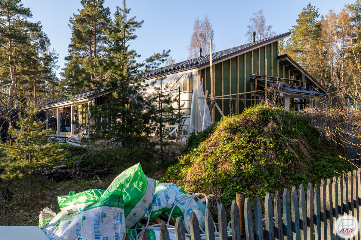 Идёт III этап стройки на нашем объекте Игора-2: Здесь у нас одноэтажный каркасный дом с двумя односкатными крышами, которые ещё называем "разноуровневой двускатной крышей" или "двухуровневой двускатной крышей", тут уж кому как больше нравится. Внешних изменений пока что минимум: готова обрешётка для навесного фасада, установлен перфорированный профиль для защиты от грызунов. Не очень-то интересные события, хотя контробрешётка – довольно важная и трудоёмкая часть фасадных работ. Надо не просто приколотить бруски вдоль стоек, а вывести их в одну плоскость. Стены не идеально ровные, есть мелкие отклонения, которые компенсируются путём использования клиньев: Можно использовать фанеру или готовые пластиковые спейсеры, не суть важно, главное – выставить все бруски ровно по нитке и уровню. Тёмные точки, про которые я в прошлый раз подробно писал, никуда не делись, конечно, но стены полностью обработали антисептиком, так что дальнейшего развития можно не опасаться. Бруски крепятся по все