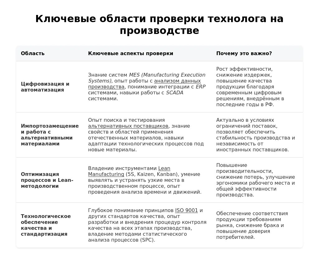 - Технические знания и опыт: Оценивается знание технологических процессов, оборудования, материалов, умение разрабатывать и оптимизировать технологическую документацию.