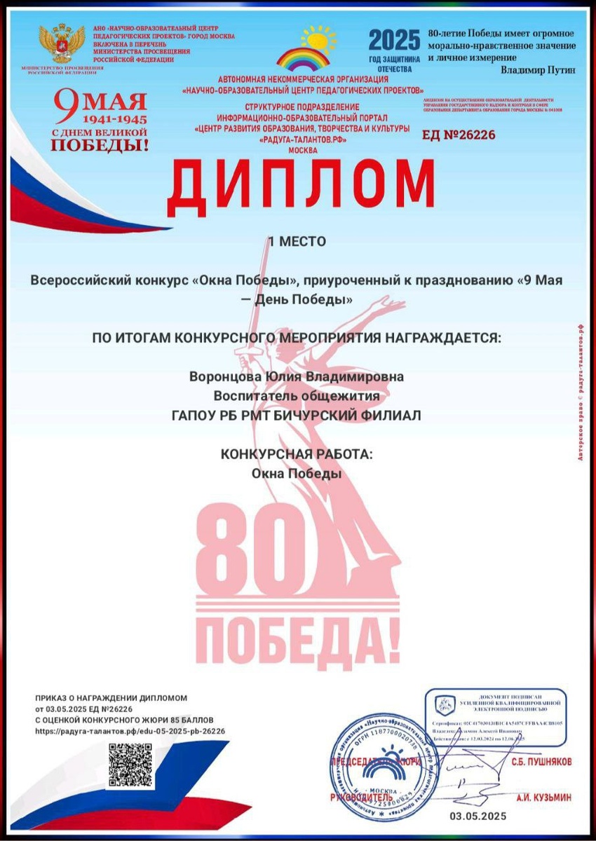 Поздравляем воспитателя общежития Воронцову Ю. В. с заслуженным 1 местом во Всероссийском конкурсе "Окна Победы"! 🎉👏 Это замечательное достижение свидетельствует о вашем таланте и преданности делу, а также о важности патриотического воспитания среди молодежи 🇷🇺❤️. #СПО_БУРЯТИИ #БичурскийФилиал #ОкнаПобеды #Патриотизм #Достижения #общежитие #Молодежь #Образование