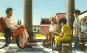 В начальной школе в Древнем Риме обучали детей с 7 до 12 лет. Дети из малообеспеченных семей завершали обучение на этапе начальной школы. Средний этап обучения проходил у девочек дома. К образованию и воспитанию девочек и девушек римляне относились очень серьезно. Образованная жительница Рима должна была обязательно знать грамматику, литературу, риторику. Некоторые занимались даже математикой, географией и медициной. Каждая образованная римлянка умела танцевать, петь и понимала музыку. Puella docta - было лучшим комплиментом молодой римлянке. А вот мальчики учились в школе. Их обучал учитель грамматик. Изучались произведения греческих и римских поэтов, писателей, драматургов и философов. Юноши знали литературу и музыку. Считалось также необходимым знать астрономию, грамматику и геометрию. Для знатных юношей была высшая ступень образования - школа ритора, где обучались ораторскому искусству и искусству спора, учились составлять речи на различные темы: по истории, лите