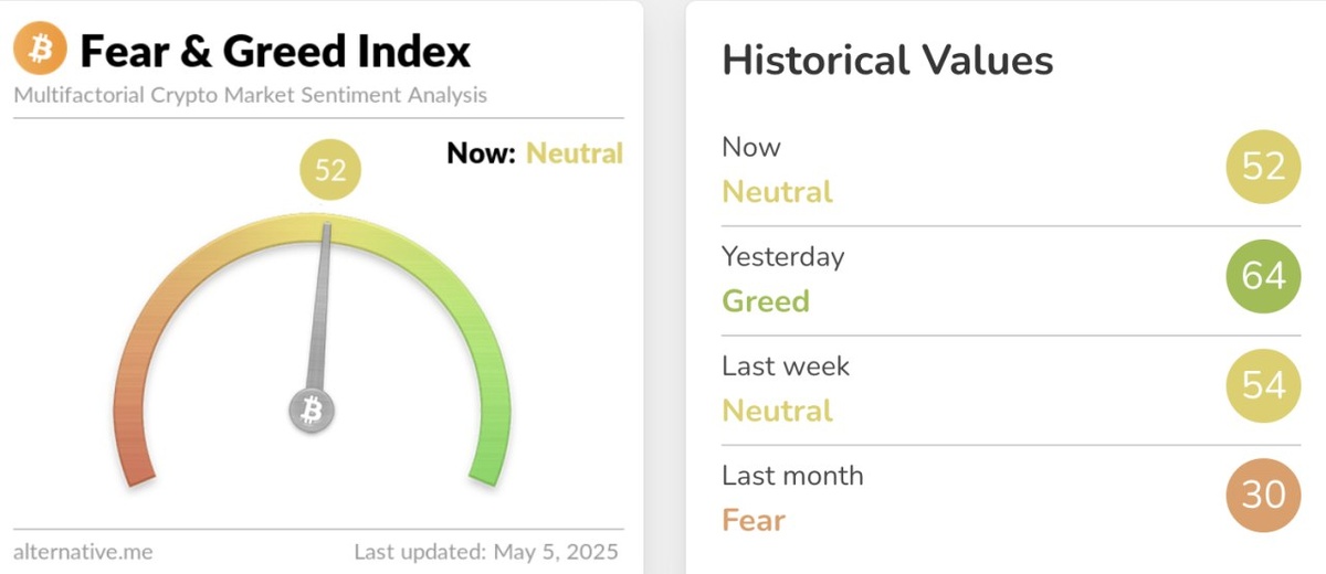 Криптовалютный «Индекс страха и жадности» на уровне 52... Жадность → Нейтрально