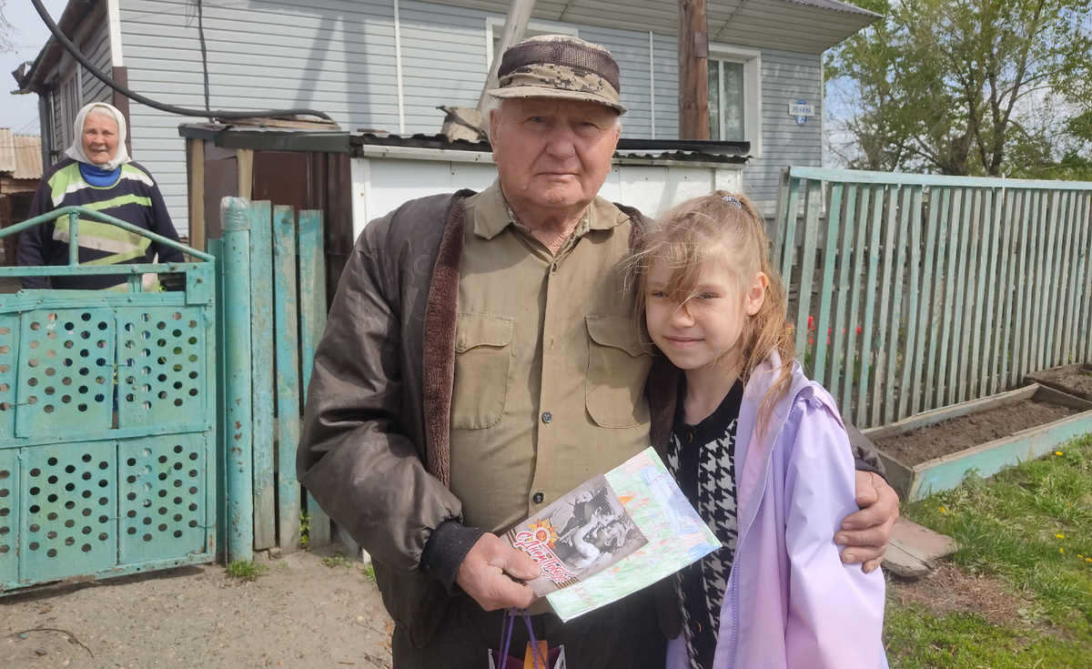 Аня Репникова занимается в Доме детского творчества с. Усть-Чарышская Пристань. Она всего во втором классе и активно проявляет себя на занятиях объединений "Доброделкины" и "Живое слово", участвуя во всех акциях, мероприятиях и постановках. Очень надеюсь, что Аня - будущий юный журналист "Эксперимента". На одном из занятий "Доброделкины" встретились с замечательным устьпристанцем Василием Игнатьевичем Чернышовым. Тема встречи - детство сейчас и в военные и послевоенные годы. "Ребенок войны", Василий Игнатьевич рассказал ребятам о том, как тогда жили, учились и проводили свободное время ребятишки. Аня описала встречу и самые запомнившиеся ей фрагменты воспоминаний. Но не ограничилась заметкой для выпуска "Внеклассный час" в газете "Авангард", а еще сделала книжку с иллюстрациями, ведь рисование - еще одно увлечение девочки. Вот такая книжка получилась: Мы решили подарить первый Анин труд герою, заодно поздравить его с днем рождения и наступающим Днем Победы! Василий Игнатьевич был о