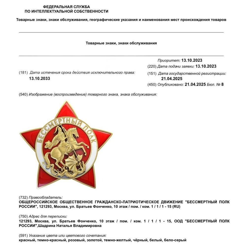 Согласно заявке, с данным логотипом в России можно будет производить и продавать до 2033 года ювелирные украшения, сумки, рюкзаки, посуду, головные уборы, игрушки, а также боеприпасы, патроны и прицелы для огнестрельного оружия. Ранее в Уфе рассказали, где и как будет организовано шествие «Бессмертного полка».
