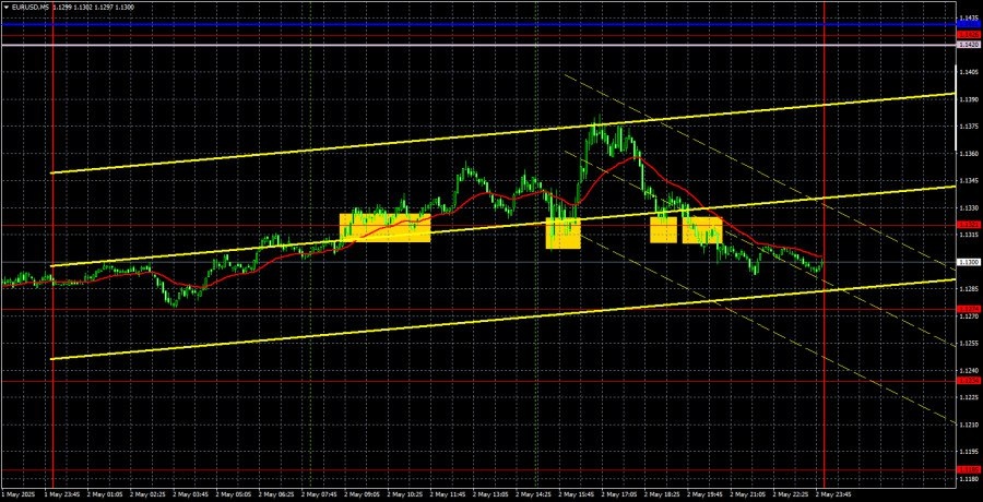 https://basechop.ru/wordpress/?p=41167 Анализ EUR/USD 5M. Валютная пара EUR/USD в течение пятницы, в общем и целом, продолжала нисходящее движение. То есть доллар рос практически всю прошлую неделю, но смысла в этом нет никакого. В понедельник американская валюта без видимых причин упала почти на 100 пунктов. За вторник, среду, четверг и пятницу она подорожала на 150. И это при том, что практически все макроэкономические данные из США провалились с треском. Таким образом, к текущему росту нельзя относиться, как к стабильному, уверенному и закономерному. Также напомним, что флэт по EUR/USD продолжается уже больше трех недель. Цена практически весь этот период времени торгуется между уровнями 1,1274 и 1,1426, и на прошлой неделе ситуация не изменилась. Поэтому все, что доллар сумел показать, это лишь небольшое укрепление в рамках бокового канала, для чего вообще не нужны какие-либо макроэкономические или фундаментальные основания. Таким образом, до тех пор, пока цена не закрепится ниже