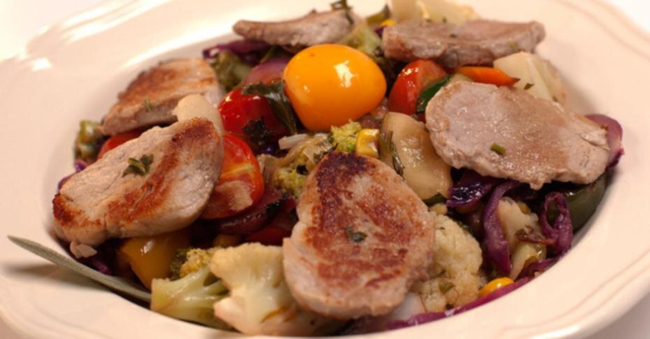 Ингредиенты: - 500 г свинины - 500 г цветной капусты - 300 г помидоров - 2 головки репчатого лука - 50 г сметаны - 4 ст. л. растительного масла - соль - перец - зелень петрушки и укропа Приготовление: Мясную вырезку освободите от лишнего жира, вымойте её, порежьте поперёк волокон на куски и хорошо отбейте молоточком. Каждый кусок натрите солью и чёрным молотым перцем, после чего обжаривайте кусочки мяса в раскалённом растительном масле до золотистой корочки.