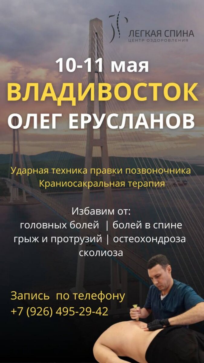 💥ВЛАДИВОСТОК 💥СУРГУТ В самое ближайшее время специалисты центра Легкая Спина будут вести прием в ваших городах. Самое время записаться на прием 😉 🟢 10, 11 мая - Владивосток, специалист по ударной технике правки позвоночника и краниасакральной терапии Олег Ерусланов 🟢 17, 18 мая - Сургут, специалист по ударной и мягкой техникам правки позвоночника и диафрагмальным практикам Александр Данилов ✍️ Запись по телефону + 7 (926) 495-29-42 с 10:00 до 20:00 по московскому времени