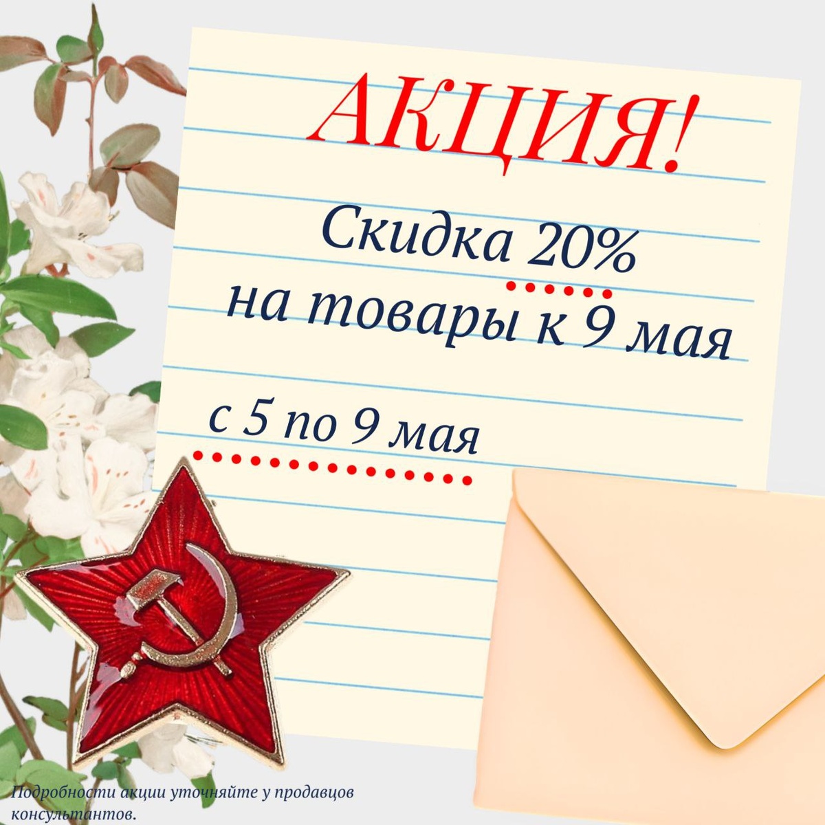 🎉 Праздничная акция в "Белой Розе"! 🌹 Дорогие любители рукоделия! В честь 9 Мая мы дарим вам скидку 20% на товары для праздника! ✨ Акция длится с 5 по 9 мая! Успейте приобрести всё необходимое! 🧵🪡 Подробности о товарах, участвующих в акции, уточняйте у наших приветливых продавцов-консультантов. Они с радостью помогут вам с выбором! 😊 Не упустите возможность украсить свои поделки и подарки к празднику! 🎁 #БелаяРоза #9мая #скидка #акция #рукоделие
